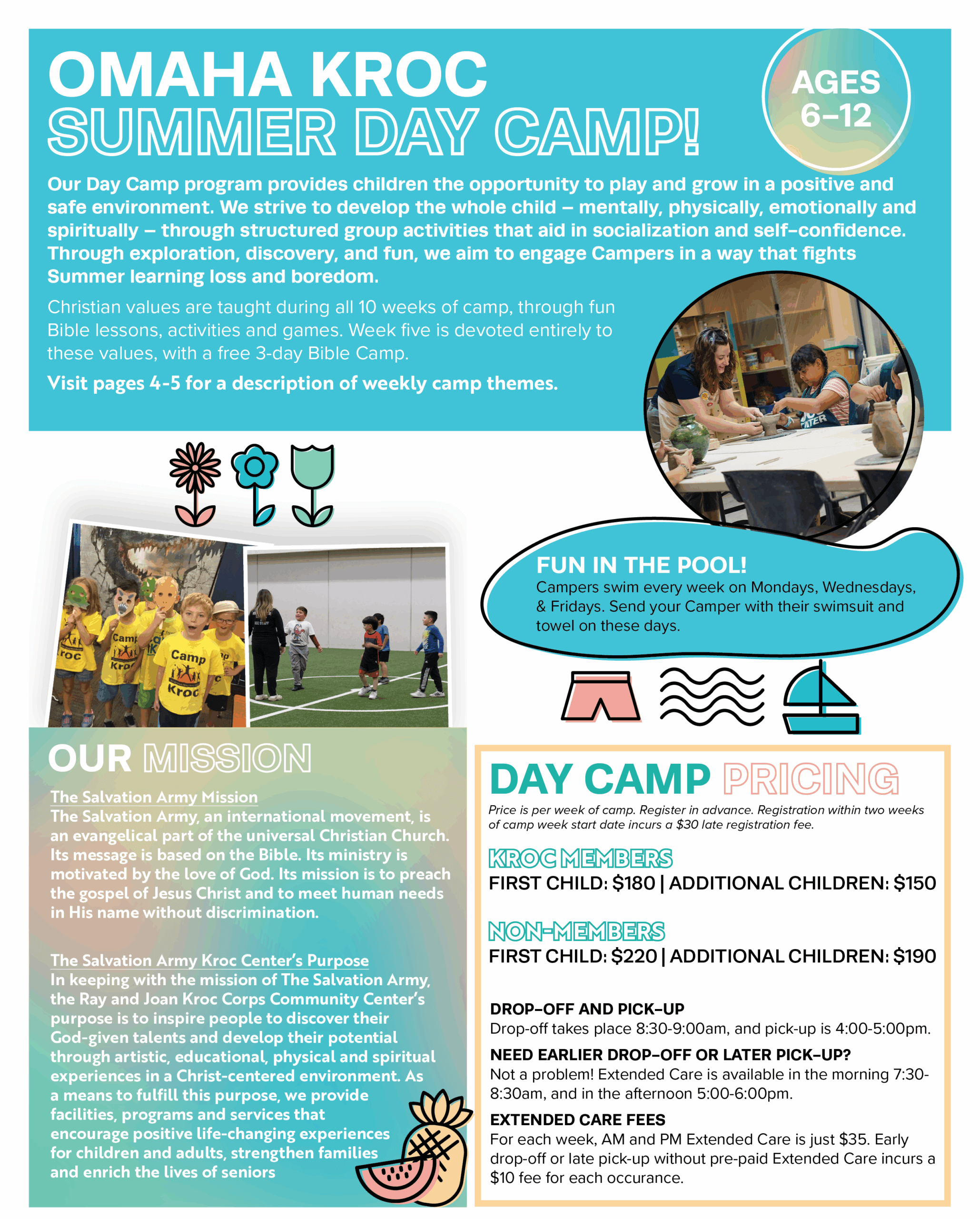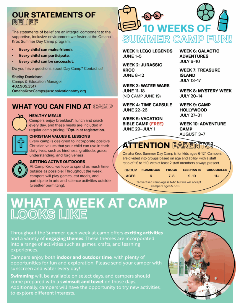 Omaha Kroc Summer Day Camp is where kids ages 6–12 make memories, try new things, and have a whole lot of fun. Each week brings exciting themes, hands-on activities, new friendships, and plenty of chances to laugh, play, and grow in a safe, caring, faith-filled environment.